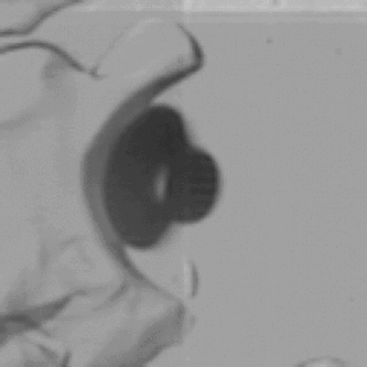 The interaction between the bubble and the solid was captured by a high-speed camera (shooting frequency of 80,000 frames per second), which describes the continuous “eating” of the solid by the bubble under pressure changes. (The video on the left is slowed down to 100 frames per second, and the video on the right is slowed down to 25 frames per second.)